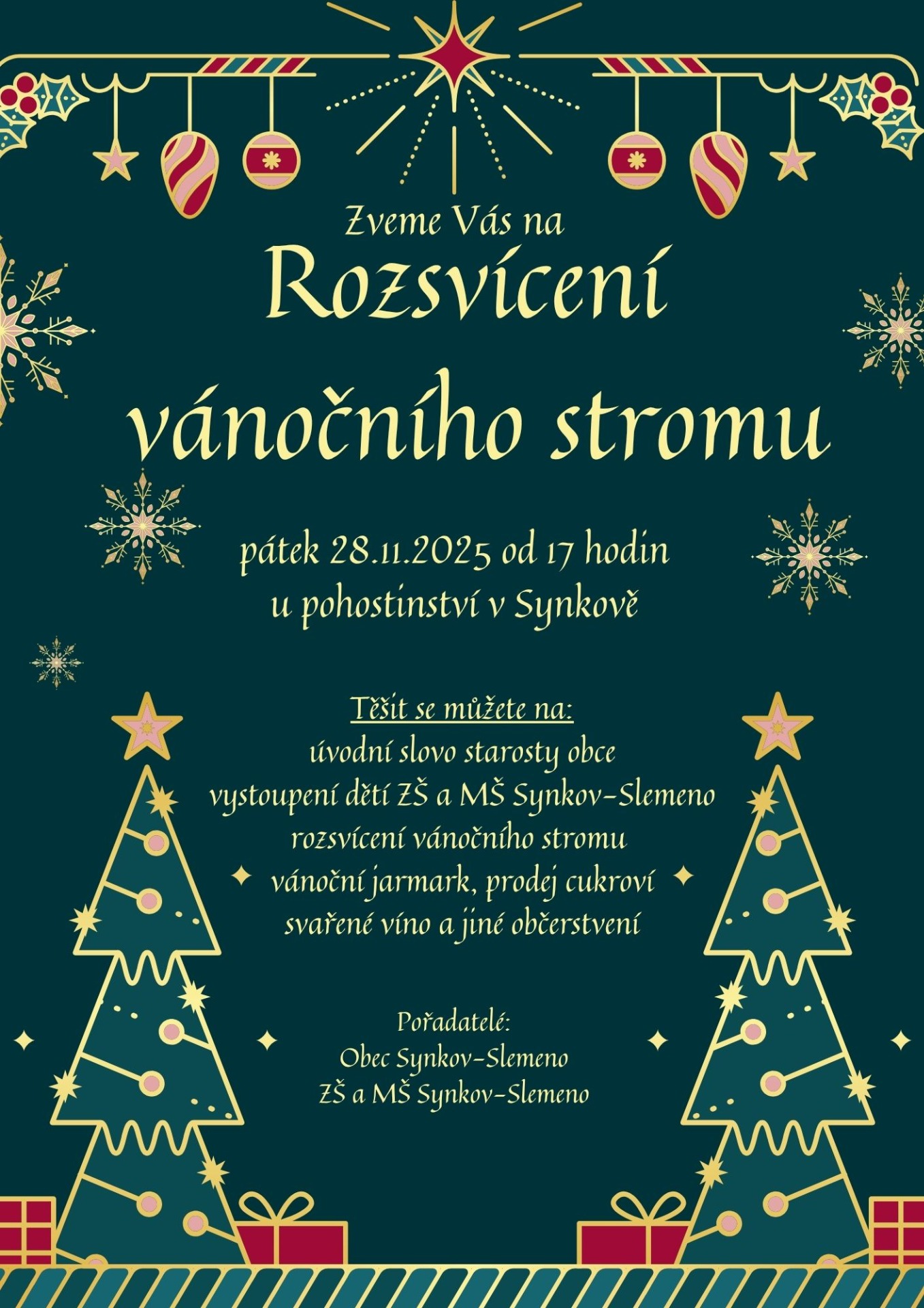 Srdečně vás zveme za Rozsvícení vánočního stromu u pohostinství v Synkově , a to v pátek 28.11.2025 v 17:00.